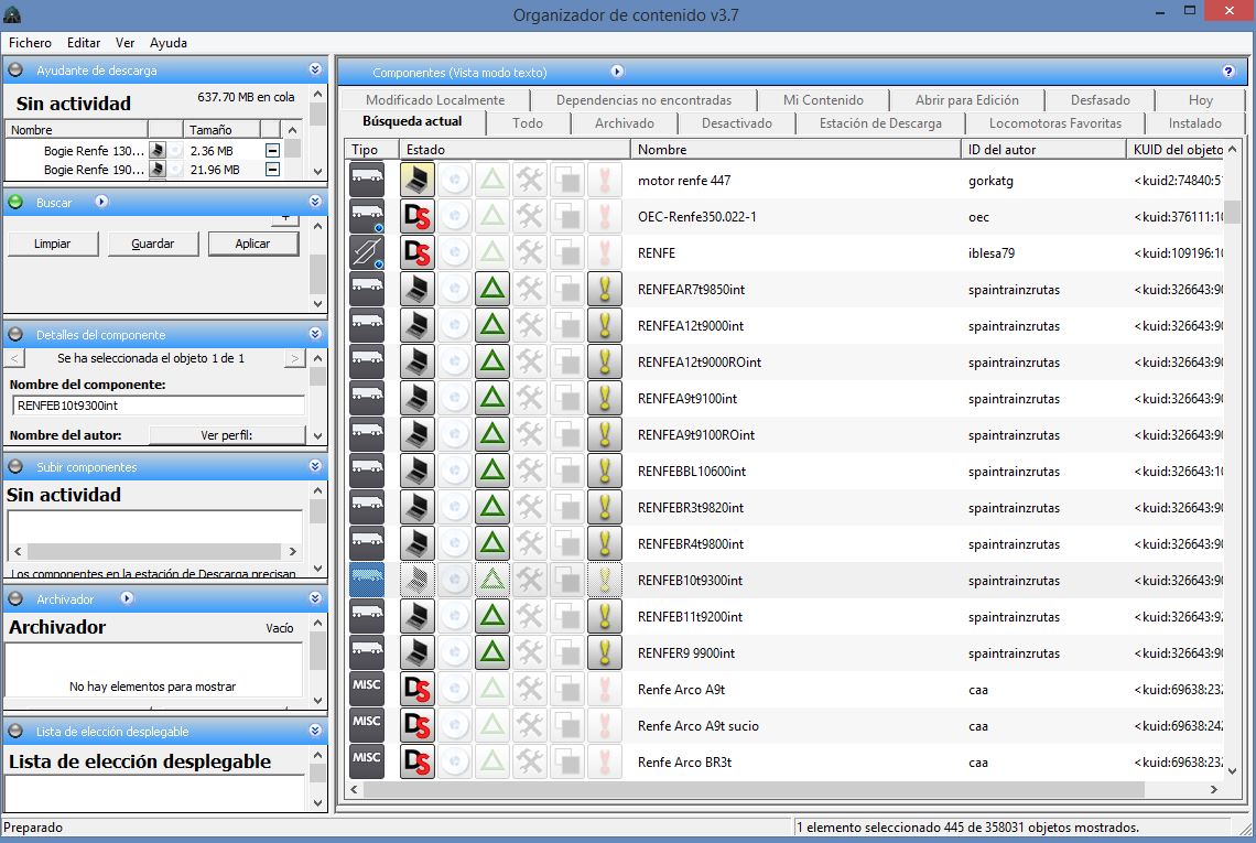 Hola, buenas tardes en su momento ya me leí el manual del juego. Pero no aclara ninguna duda de lo que me ocurre... A ver, yo por ejemplo me descargo un tren, viene en un Zip, lo extraigo y tengo el archivo CDP. Una vez tengo abierto el organizador de contenido me voy a Fichero, y selecciono la opción "Importar CDP" Selecciono el archivo y todo bien, luego me voy al buscador y encuentro los archivos de la locomotora que me he descargado. Hago lo que me han comentado en otros foros click derecho y descargar. Veo que arriba a la derecha en descargas comienza y muy poco a poco se van descargando los archivos con su click verde. Una vez ha acabado me voy a las cocheras y este es el resultado. Desde luego, no se si estaré haciendo algo mal...