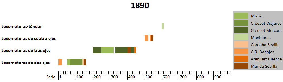 Hemos visto la evolución del parque de locomotoras de M.Z.A. desde las primeras máquinas del Aranjuez, y podemos constatar que en los diferentes ferrocarriles españoles se tipificaron las locomotoras por los tres tipos básicos: de servicios de viajeros, de servicios mixtos o mercancías ligeras y de servicios de mercancías pesadas.