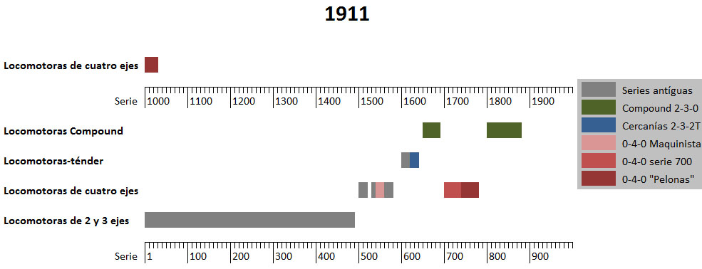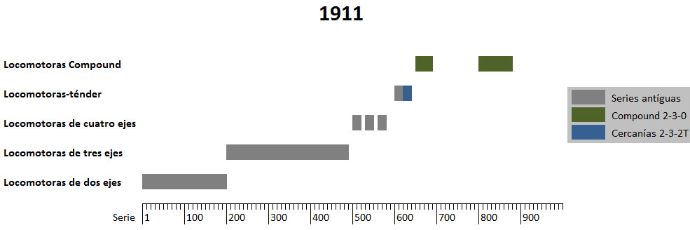 Este estudio excluía las recientes adquisiciones de máquinas tipos 2-3-0, 2-3-1 y 2-4-0, así como las locomotoras-ténder 2-3-2T de cercanías, todas ellas adquiridas ya a partir del año 1900.