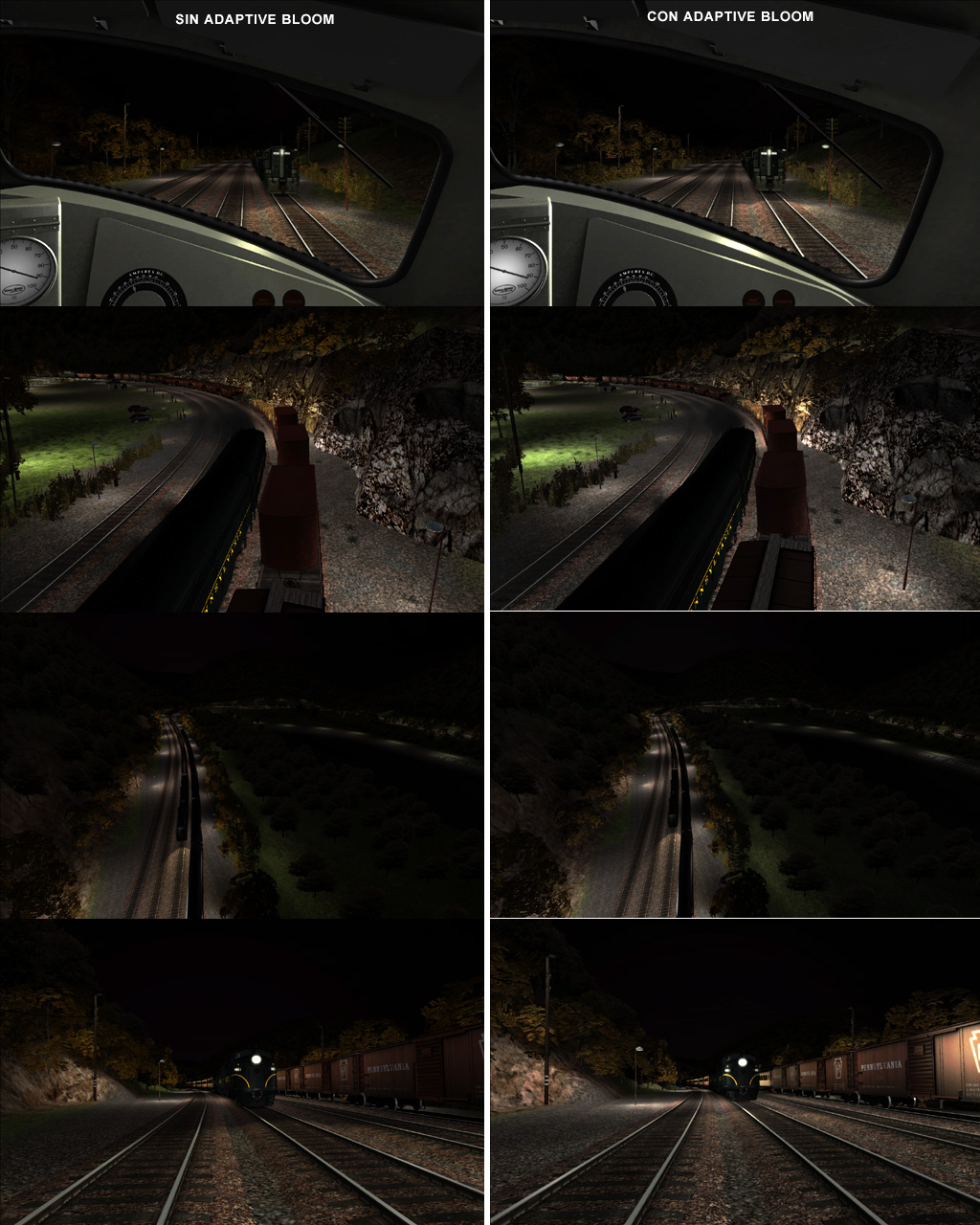 Adaptive Bloom: cálculo para "afinar" el bloom o glow. Tiene relación con la iluminación, en concreto, las fuentes de luz, y es el efecto artificial que se genera en las lentes ópticas de las cámaras, que generan un efecto de volumen luminoso alrededor de la intensidad de la luz.