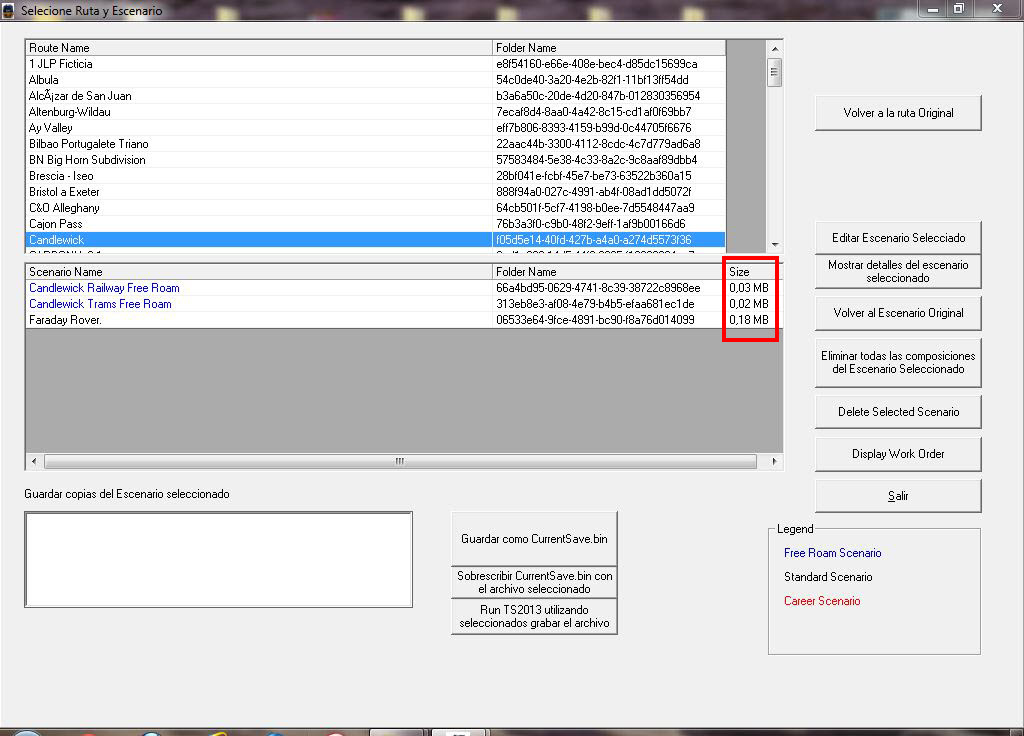 «Nuevo botón "Show Invalid Scenarios" en la pantalla Scenarios/Editar Escenarios. Al clicar en una ruta en el cuadro de arriba, se mostrará en el cuadro de abajo una lista con las carpetas de sus escenarios con sus respectivos tamaños. Si a continuación clicamos en el botón "Show Invalid Scenarios" se abrirá una nueva pantalla con la lista de carpetas de escenario que están vacías o que no tienen incluído el archivo ScenarioProperties.xml (parece ser un nuevo problema de TS2013 - cantidad de carpetas de escenarios vacías). Si seleccionamos todas esas carpetas de la lista podemos clicar en el botón "Delete Selected Folders" para borrarlas de nuestra instalación. No sé si alguna actualización de Steam resucitará estas carpetas.»