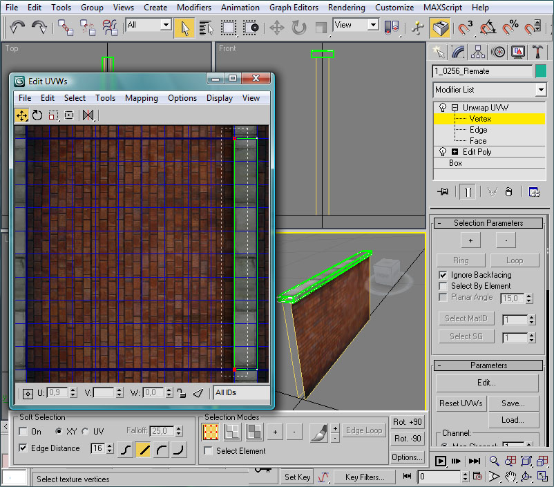 Repetiremos esta acción para el otro lado del muro. Una vez ambos lados tengan el mapeo correcto, nuevamente entraremos en el editor UVW para ajustar el mapeo a la zona de ladrillos exclusivamente: