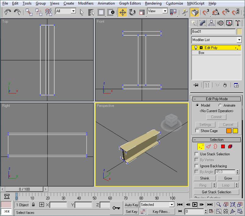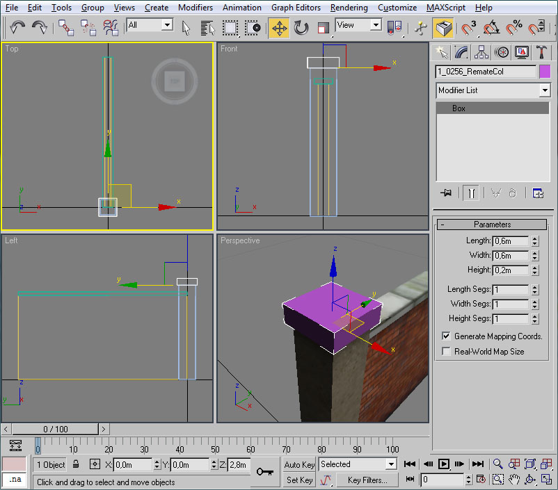 - Una vez abierto el editor UVW pincharemos en un viewport (el de perspectiva será ideal) sobre un lateral del muro.