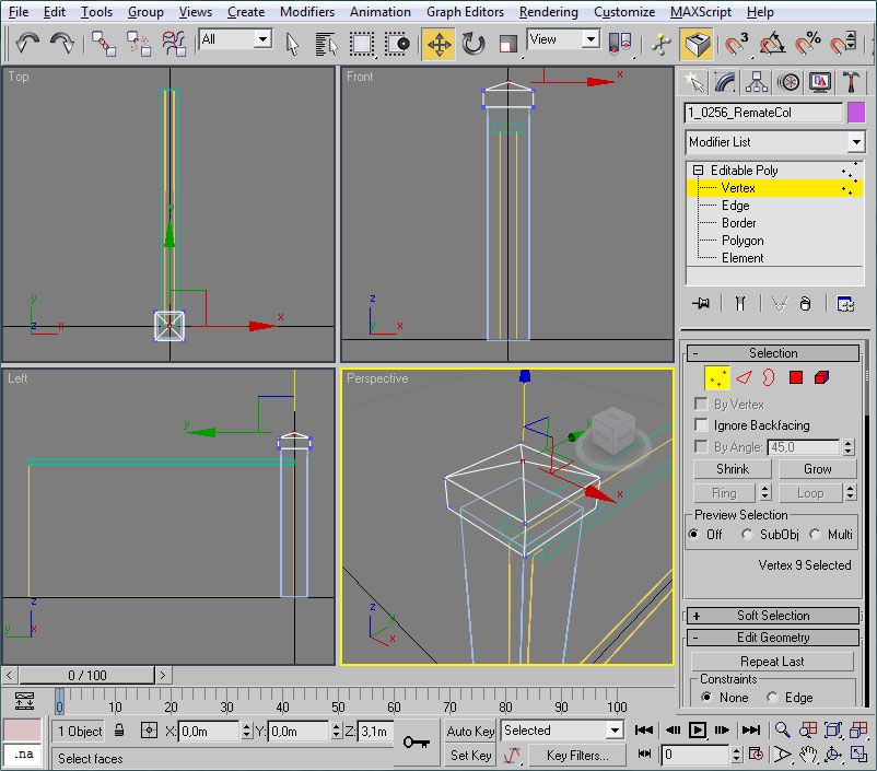 - Creamos con el ratón una selección que incluya los vértices superiores del muro (son los que quedan a la derecha de los mapeos una vez girados).