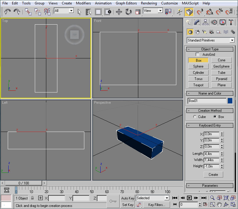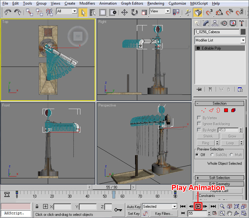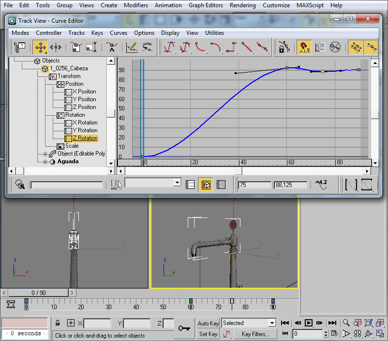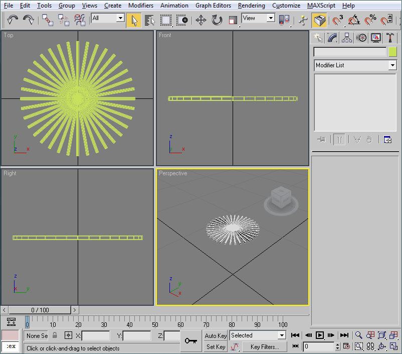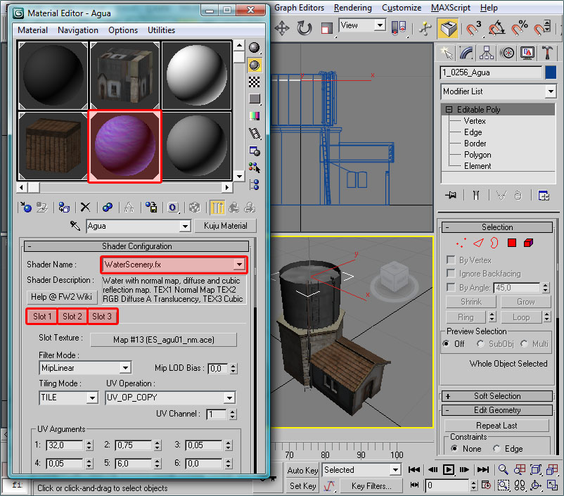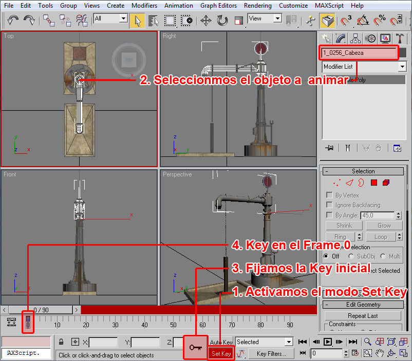 Donde he señalado en rojo el procedural, el cual recuerdo que debe tener todos sus puntos con la coordenada Y=0 (coordenada en 3ds), el pivote centrado en la escena y la extrusión de dicho procedural orientada en la dirección Y del pivot del objeto (con la longitud que deseemos para las texturas).
