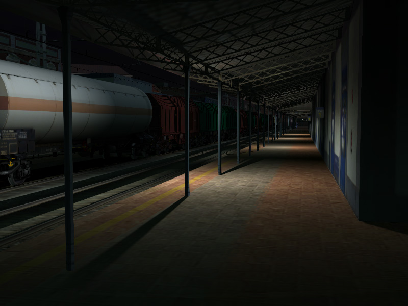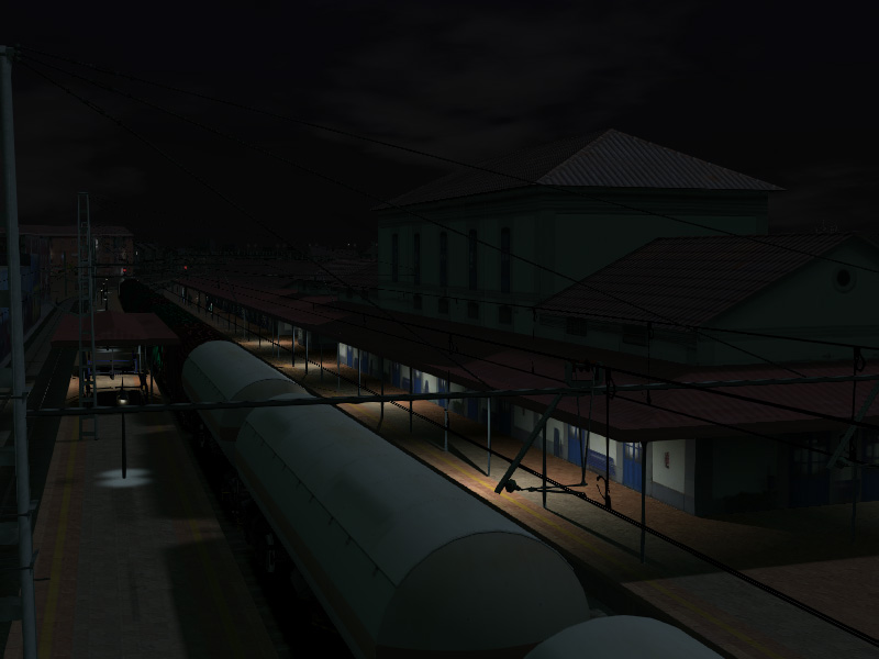 En una primera aproximación al tema he procedido a colocar unas cuantas 'farolillas' con las luces que incluye el TS2012 por defecto en el editor. A pesar de su enorme potencia y el aspecto tétrico sirvan estas capturas para mostrar el principio de lo que se podría conseguir con el nuevo motor del simulador. Habrá que investigar valores para poder hacer que esta bonita estación luzca en la noche como merece. Siento la calidad de las capturas, pero mi ordenador va muy justito y con tantas luces y tantas sombras no he conseguido moverme con soltura (1 fps cada 2 segundos es una tortura para moverse).