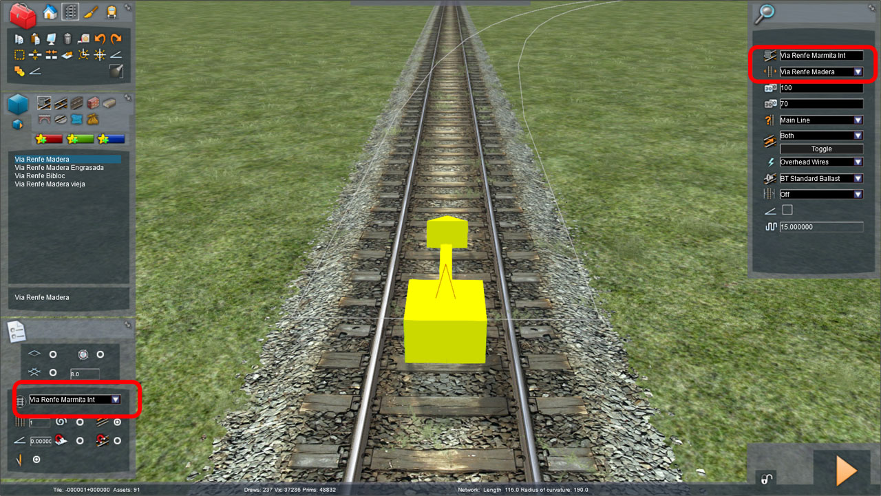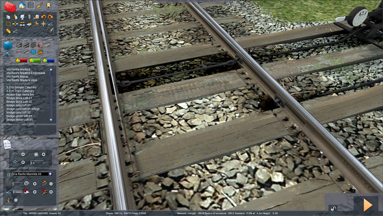 ComplementosTodas estas vías pueden mostrar una catenaria de doble hilo de contacto. La altura del hilo de contacto se ha establecido en 5,300 metros, superior a la altura que presenta la catenaria en las rutas europeas del simulador, pero ajustado al valor utilizado en Renfe. La catenaria aparecerá al tender vía con la opción “Electrification” con el valor “Overhead Wires”.