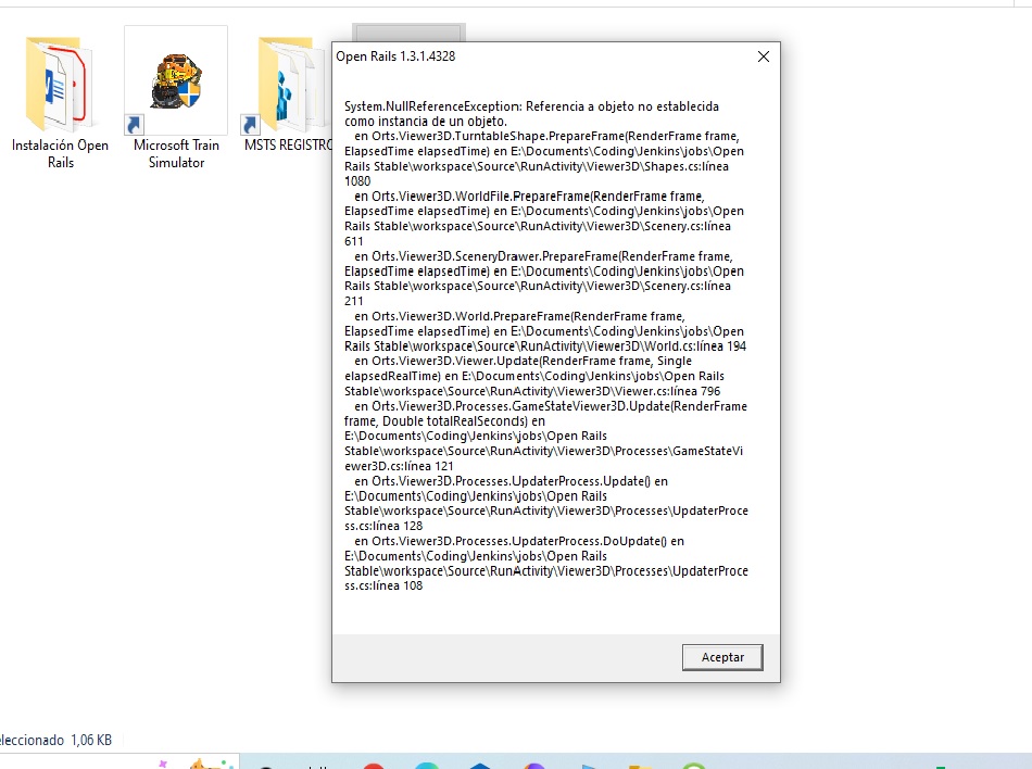 Se ruega, cuando tengáis algún cuelgue del simulador con la ruta, en el mensaje adjuntar el archivo OpenRailsLog.txt que crea Open Rails en el escritorio para poder analizar el error. De lo contrario sera difícil adivinar que sucede.