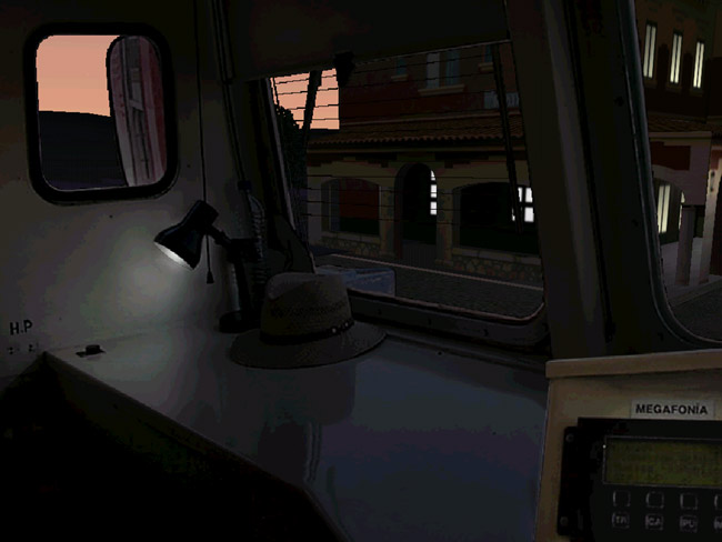 Bueno, vamos a lo que interesa. Por un lado, estoy haciendo ahora las versiones iluminadas de las vistas laterales, de las que pongo dos capturas. Pulsando CONTROL+L se enciende la iluminación de cabina, y he aprovechado ésto para hacer que el flexo que se encuentra de manera habitual en lo que fué el puesto del ayudante del maquinista, se encienda y se apague. En las capturas se aprecia algo pero en el simulador es una caña, es clavaíto a la realidad.