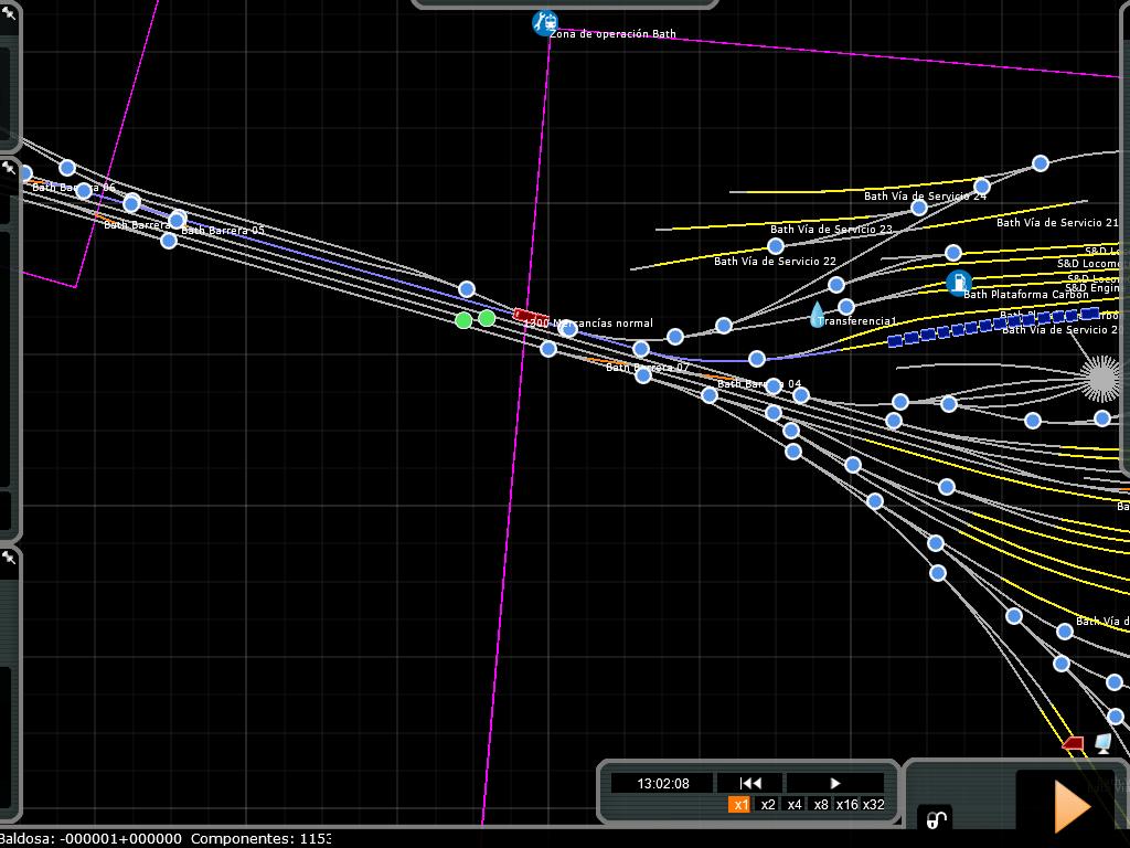 Ya puestos, sobrepaso la señal, al saber que no hay otros trenes, y después de pasar por los cambios manuales que indica el path, paro e incio la marcha atrás para recoger los vagones, pero no hay forma poder hacer el cambio de agujas que dejo detrás y que me llevaría en el camino correcto. Ni con alt+G, ni con el ratón, accionando la palanca del cambio,(ésta si se mueve, pero no los espadines) ni pulsando sobre el disco azul en el mapa 2d. Es curioso ver en este mapa que al pulsar sobre el cambio, la linea que nos indica el camino no cambia de color, se queda en blanco. Le doy otra vez y se pone azul, pero en la dirección contraria a la que quiero ir. La dejo en blanco, doy marcha atrás y se mete por la vía incorrecta. Y así siempre. No hay forma de que cambie hacia la vía correcta.