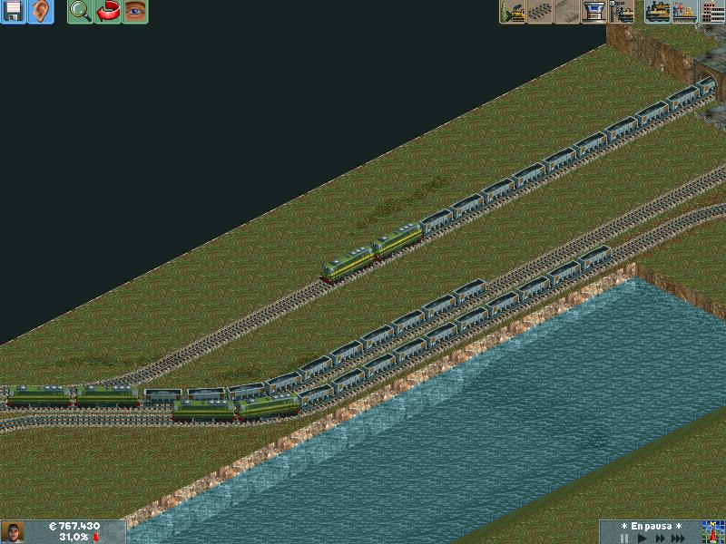 En mis redes procuro separar los trenes por velocidad, ya sea pasajeros o mercancías. Después de muuuuchas horas he conseguido dominar la IA del juego y rara es la vez que algún elemento se me despista (generalmente en obras...)--truco: hacer todo lo que se pueda en ro-ro!. Dejo unas poquitas fotos