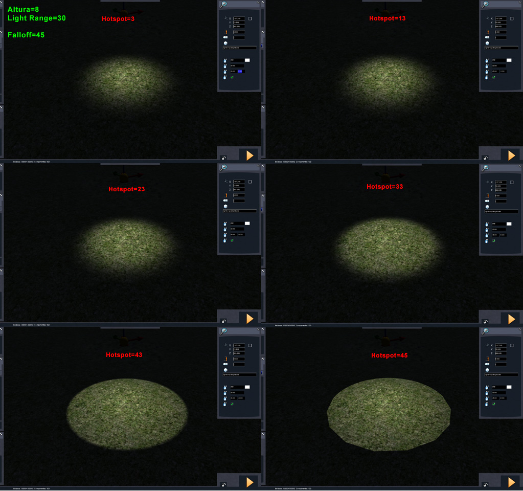 Unas imágenes para comprender el efecto en el simulador de los parámetros de las luces spot (clic para agrandar):