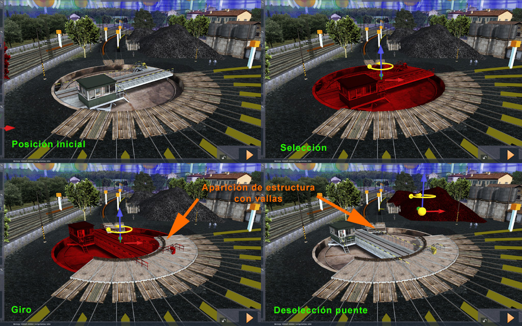 Al parecer hay un pequeño truco para poder realizar tales escenarios, que en su día me comentó Jordi Hernández, y consiste en que la posición del puente giratorio al inicio de la actividad no debe dar vía a la locomotora que conducimos, o mejor a ninguna vía si es possible. Me explico: