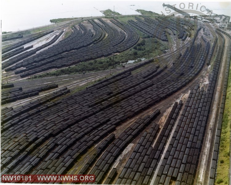 Como muestra de la importancia de éste tráfico, un par de vistas aéreas de las playas de vías de Lamberts Point, en el puerto de Norfolk, con los embarcaderos al fondo, donde esperaban las composiciones de carboneros.