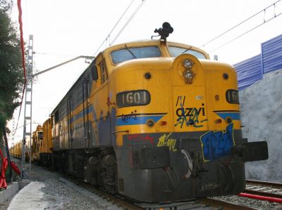 Locomotora 1601 de Azvi, encargada de mover el tren de trabajos de desdoblamiento de la línea Málaga-Fuengirola. Su presencia es poco habitual por estos lares.