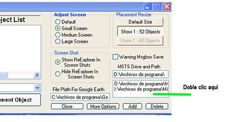 Antes de empezar a trabajar con el programa tendremos que indicarle la ruta a nuestra instalación o instalaciones MSTS y la ruta al Google Earth —en caso de disponer de él— para ello haremos clic en el botón Options y se abrirá una ampliación de la ventana del programa.