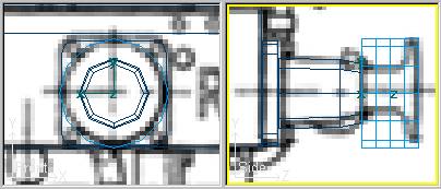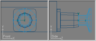 Para la segunda de las piezas del tope, el cuerpo, crearemos un cilindro pulsando Part » Add » Tube (o el icono de [New Tube] en la paleta de Partes), al cual le daremos las dimensiones: Radius=0.11, Points=8, Length=0.26, Sections=2 y marcaremos que el eje del cilindro se estructura a lo largo del eje Z. Para garantizar la correcta alineación con la base, editaremos las propiedades de la pieza con Edit » Part Properties (o bien pulsando la tecla [F2]) dando los valores a la posición del eje iguales a la base: X=1, Y=1.03, Z=4.1. A continuación, moveremos la pieza en la vista lateral, restringiendo esta vez la transformación para los ejes X y Y, hasta su posición enrasada con la base del tope. Obtendremos una imagen semejante a la siguiente: