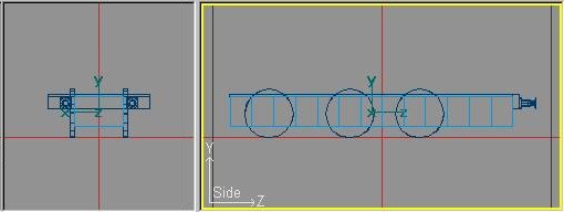 Este elemento no es imprescindible, pero dado que es claramente visible desde el frente, lo realizaremos esquemáticamente. Simularemos las cajas de grasa con un cubo de dimensiones: Width=0.18, Height=0.32, Depth=0.32. Lo situaremos centrado con el eje del bisel poniendo su centro en X=0.65, Y=0.44 y Z=3.37. Duplicaremos este elemento para crear la otra caja de grasa con Copiar y Pegar, y la colocaremos simétrica a la primera cambiando el signo del eje X=-0.65. A continuación simularemos la ballesta de la suspensión con otro cubo de dimensiones: Width=1.30, Height=0.26, Depth=0.47 y con dos secciones a lo ancho Width Sections=2. Pasaremos a modo de edición de puntos con Mode » Point (o bien pulsando la tecla [F8]), entraremos en modo selección por ratón con Mode » Select (o pulsando la tecla [F11]) y seleccionaremos los puntos de las esquinas superiores, para moverlos en el eje Y hacia abajo hasta la posición aproximada que se ve en la imagen siguiente: