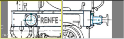 - | Nos situaremos en la vista lateral (inferior derecha) pulsando con el ratón en ella y cargaremos el Backdrop con '''View » Backdrop » Load'''. Iremos al subdirectorio Backdrops y seleccionaremos el archivo ESRN130-2124L.BMP (los Backdrops pueden descargarse desde la página de Introducción del tutorial). A continuación daremos la escala a la que está realizado el Backdrop con '''View » Backdrop » Scale''' e introduciendo los valores ''Distance=9.2, Image Pixels=640'', puesto que esta es la distancia real que hay entre topes en la locomotora, y así mismo estos son los píxeles en la imagen (entre topes) cuando se ha creado. La imagen quedará escalada y centrada respecto a la vista. Por último posicionaremos el Backdrop en su lugar pulsando | + | Nos situaremos en la vista lateral (inferior derecha) pulsando con el ratón en ella y cargaremos el Backdrop con '''View » Backdrop » Load'''. Iremos al subdirectorio Backdrops y seleccionaremos el archivo ESRN130-2124L.BMP (los Backdrops pueden descargarse desde la página de Introducción del tutorial). A continuación daremos la escala a la que está realizado el Backdrop con '''View » Backdrop » Scale''' e introduciendo los valores ''Distance=9.2, Image Pixels=640'', puesto que esta es la distancia real que hay entre topes en la locomotora, y así mismo estos son los píxeles en la imagen (entre topes) cuando se ha creado. La imagen quedará escalada y centrada respecto a la vista. Por último posicionaremos el Backdrop en su lugar pulsando [Ctrl] + [Flechas del cursor] (izquierda, derecha, arriba o abajo) hasta que el nivel de la vía se alinee con el eje horizontal (línea roja) y los topes queden ajustados a la caja anteriormente creada. De esta manera el objeto que construyamos quedará centrado y alineado respecto al mundo en MSTS. El hecho de que el tejado de la cabina quede fuera de las dimensiones citadas no nos tiene que importar puesto que una vez finalizado el modelo debe cubrir la parte anterior del tender. |
