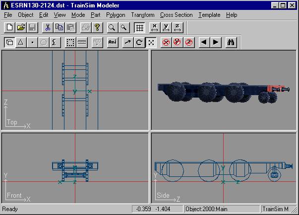 Para verificar el correcto funcionamiento del conjunto creado hasta ahora, compilamos el proyecto con File » Create TS Object File, cumplimentando en el campo Object Name=RENFE130-2124, en el campo Object Filename debemos indicar la ruta del directorio donde se creará el archivo .s de definición del objeto para MSTS, por ejemplo C:\Archivos de programa\Microsoft Games\Train Simulator\TRAINS\TRAINSET\RENFE130-2124\RENFE130-2124.s, para lo cual es necesario que el directorio en cuestión esté creado, y recordemos marcar las tres casillas indicadas como Convert Textures, Convert to Binary y Replace Existing Files. Terminada la compilación podemos salvar el proyecto para guardar el trabajo realizado hasta ahora con File » Save.