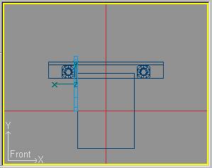 Crearemos un cilindro pulsando Part » Add » Tube (o el icono de [New Tube] en la paleta de Partes), al cual le daremos las dimensiones: Radius=0.17, Points=12, Length=0.18, Sections=4 y marcaremos que el eje del cilindro se estructura a lo largo del eje Z. Para garantizar la correcta alineación con la base, editaremos las propiedades de la pieza con Edit » Part Properties (o bien pulsando la tecla [F2]) dando los valores a la posición del eje iguales a la base: X=1, Y=1.03, Z=4.1. A continuación, moveremos la pieza en la vista lateral, restringiendo esta vez la transformación para los ejes X y Y, hasta su posición enrasada con el cuerpo del tope. Obtendremos una imagen semejante a la siguiente: