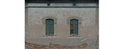 A partir de la fotografía lateral de la casilla, escuadraremos las líneas superior e inferior, así como las laterales, para conseguir una textura de la pared lateral del edificio.Esta imagen la deberemos "limpiar" de elementos molestos (en este caso las sombras de las catenarias) y una vez obtenida la textura a nuestro agrado la ubicaremos en una hoja de texturas. Para este proyecto he pensado que bastará una hoja de 512 x 512 píxeles para las texturas de las paredes de edificio. de esta hoja, reservaremos la mitad superior (altura de 256 píxeles) para la pared lateral, y en este lugar colocaremos la textura obtenida. Se verá una imagen como la mostrada en TxFact01. Podéis "pinchar" en la imagen para verla a mayor resolución.