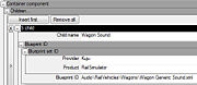 Los sonidos se añaden en el blueprint usando la sección Container component, donde los podemos añadir como un Child más.Expandiremos el apartado Children y pulsaremos el botón Insert first, para crear una sección que contenga los datos de sonido. En dicha sección informaremos:
