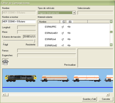 A la derecha se muestra una captura típica del editor de composiciones, incluido en el editor de actividades. Aquí aparece una composición denominada "MER 333040 + 9butano.con" y que, como su nombre indica, es una tren de mercancías compuesto por la locomotora 333-040 y nueve cisternas de butano. Además, se encuentra desplegada la lista de vagones de mercancías.